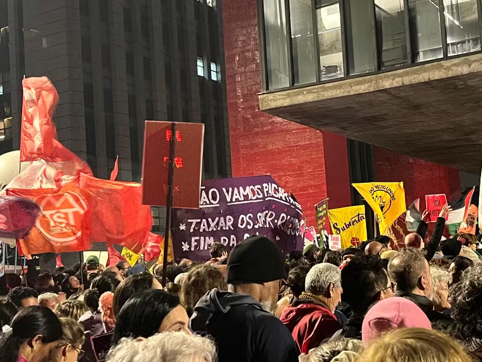 Milhares de manifestantes ocuparam a Avenida Paulista, em São Paulo, na noite de quarta-feira (10), em protesto contra o tarifaço imposto pelo ex-presidente dos Estados Unidos, Donald Trump, a produtos brasileiros, e em defesa da taxação dos super-ricos.